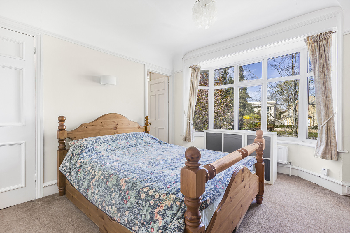 Wide stairs with decorative balustrades lead to the first floor, past a distinctive triangular corner window on the half-landing. The main bedroom has a large bay window and a good-sized en-suite shower room. The two further bedrooms have fitted wardrobes with the rear bedroom, also housing the airing cupboard. A replica staircase leads to the attic bedroom which is partly under the eaves and has a large triangular window overlooking the garden.