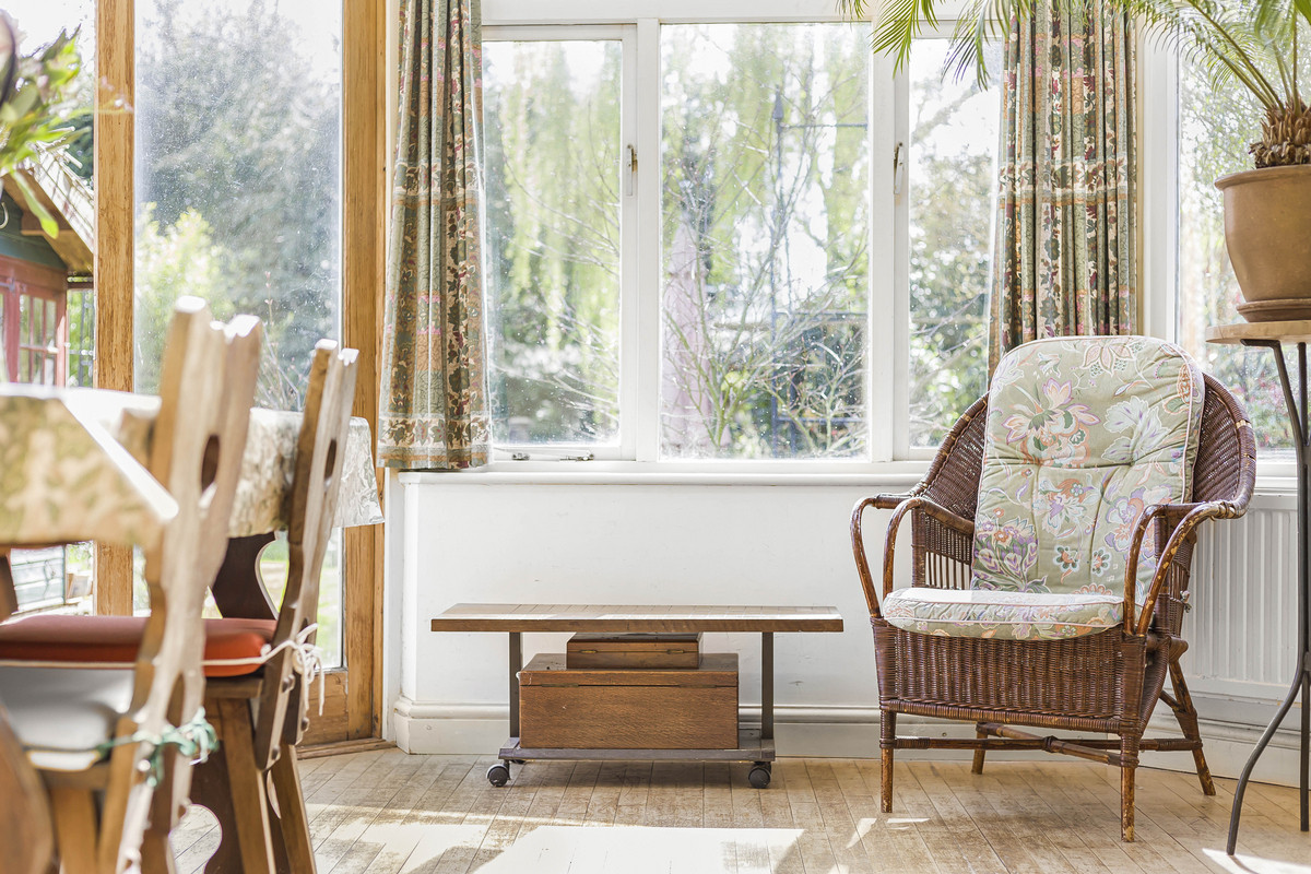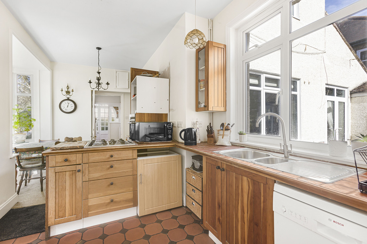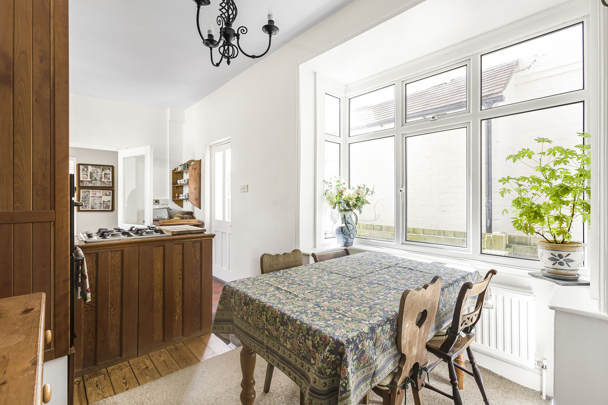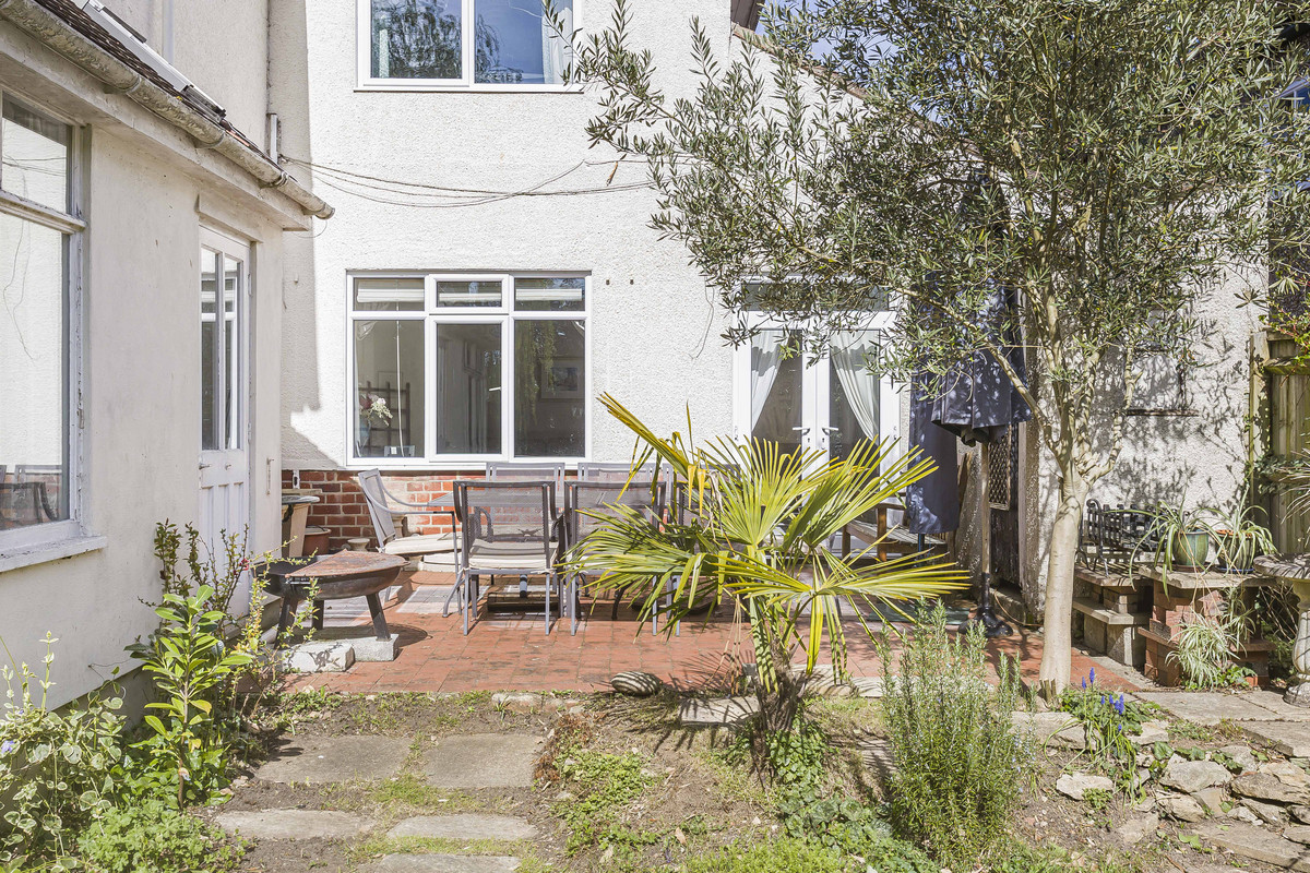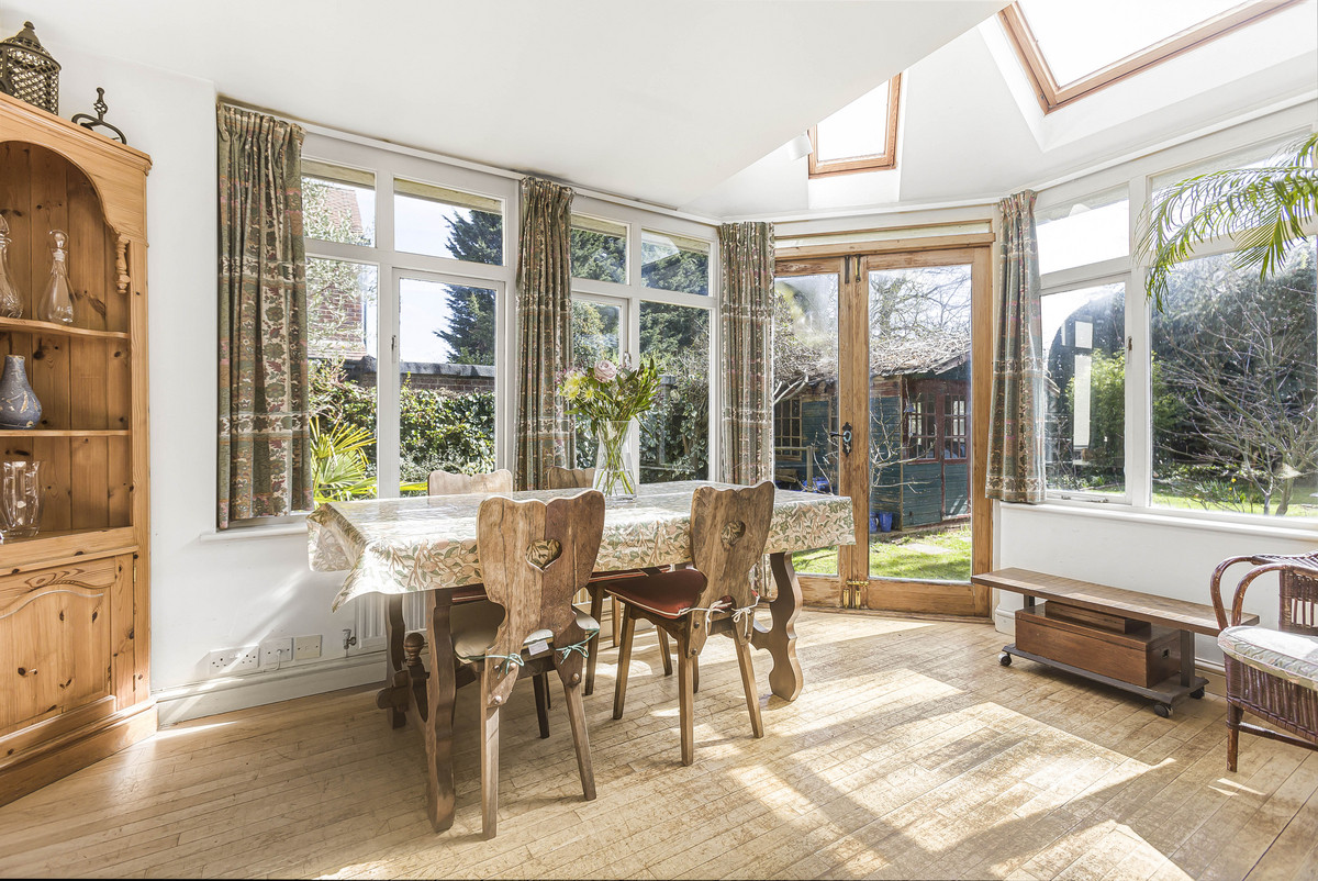 The spacious sitting room has a large window overlooking the garden and double doors to a terrace providing a secluded outdoor seating area. The kitchen has space for a breakfast table in the side box bay, a window overlooking the terrace and a door to the side access. There is utility lobby leading to a sunroom at the rear of the house which is a bright dining room with Velux rooflights, a wall of windows and double doors to the garden.