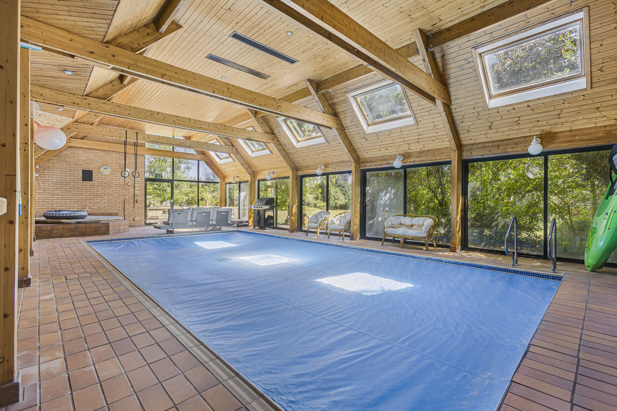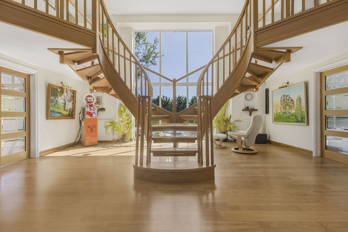Built in the 1980s, the main residence extends to around 7,047 sq. ft. of living space. The large and impressive reception hall with its eye-catching feature staircase, leads to the extensive ground floor reception rooms and pool complex, whilst on the first floor is the main bedroom suite which includes a dressing room and en-suite bathroom, with six further bedrooms and five bathrooms.