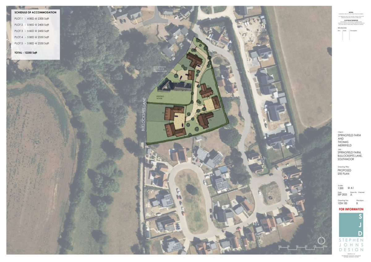 Springfield Farm is a uniquely flexible property and can be enjoyed in its current form but it also offers a number of valuable development possibilities. A pre- application for the replacement of the existing house with 10 new homes has already been submitted and the principal of re-development was given a positive response by the Vale of the White Horse District Council. This opens up the possibility of other combinations of development e.g. Retention of the existing house and a development of 5 houses as shown on Proposed site plan Rev. B which has been drafted as an example only.