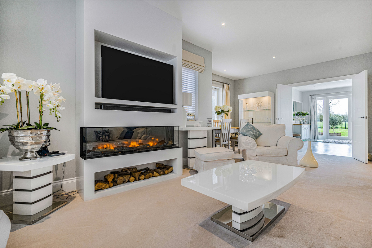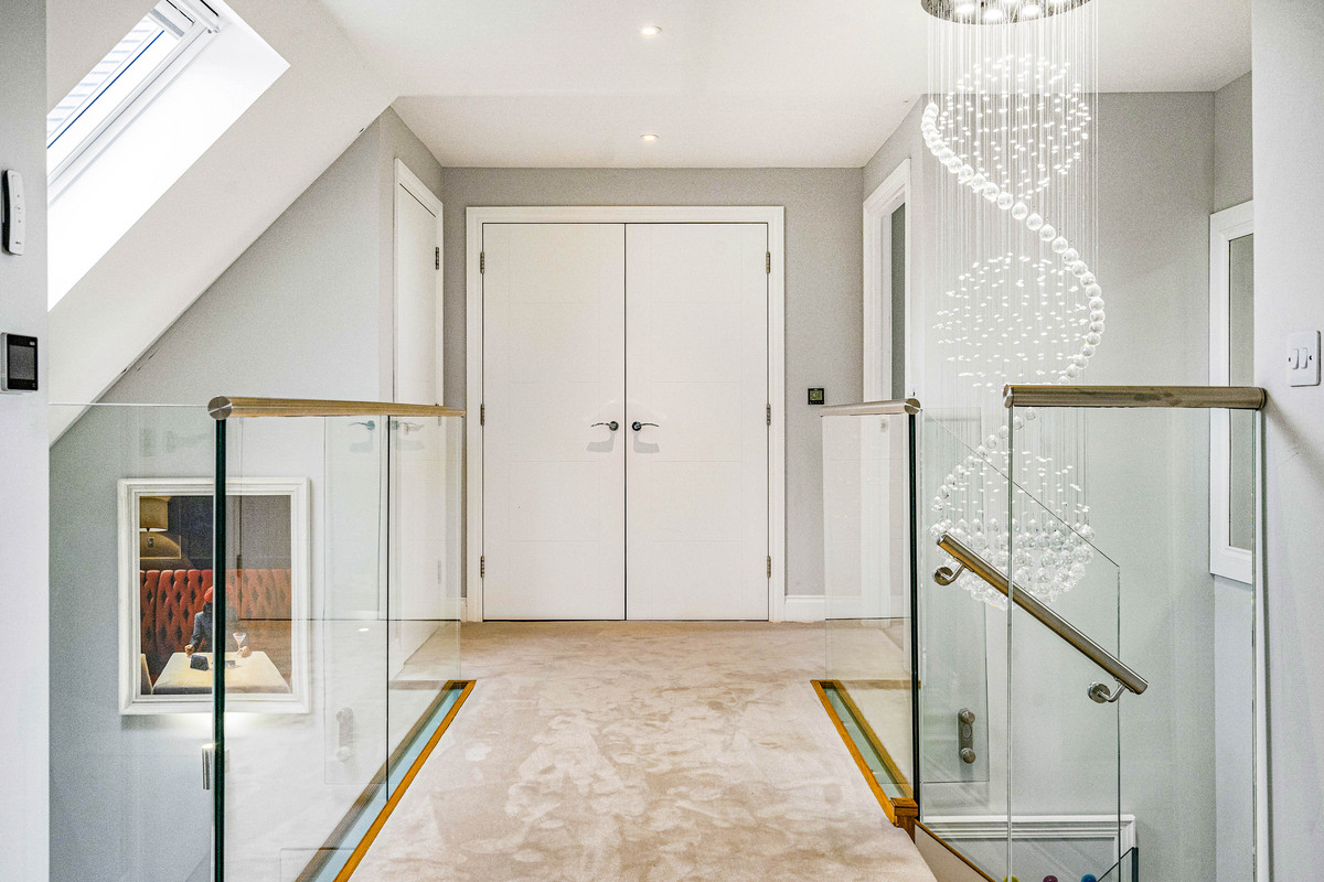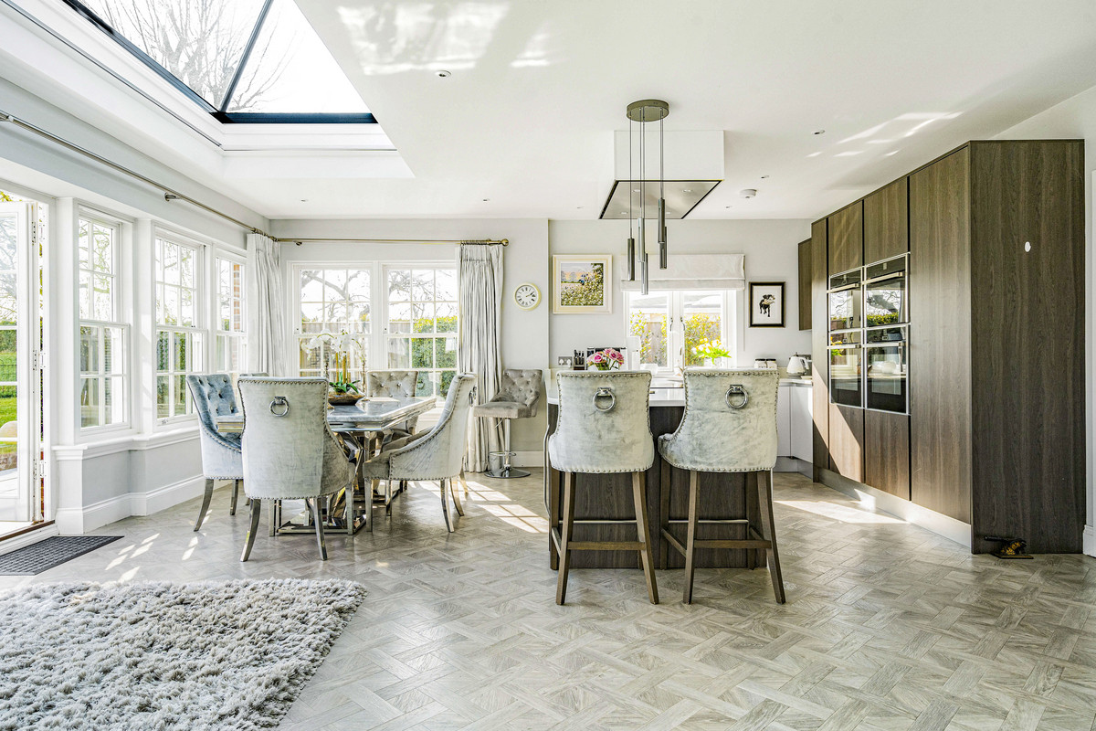 A particular feature of the house is the sleek fitted kitchen with ‘Silestone’ quartz work surfaces, breakfast bar and integrated appliances including; steam oven, two electric ovens, microwave, large fridge, dishwasher and wine fridges.