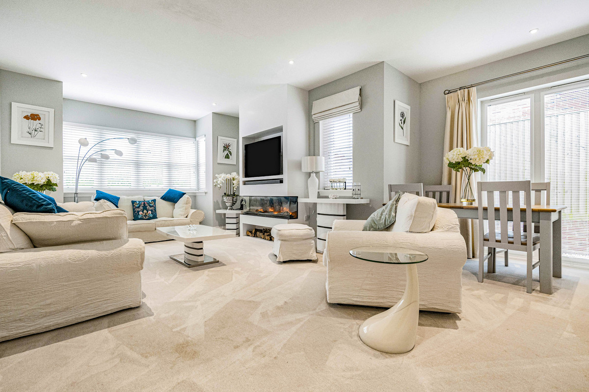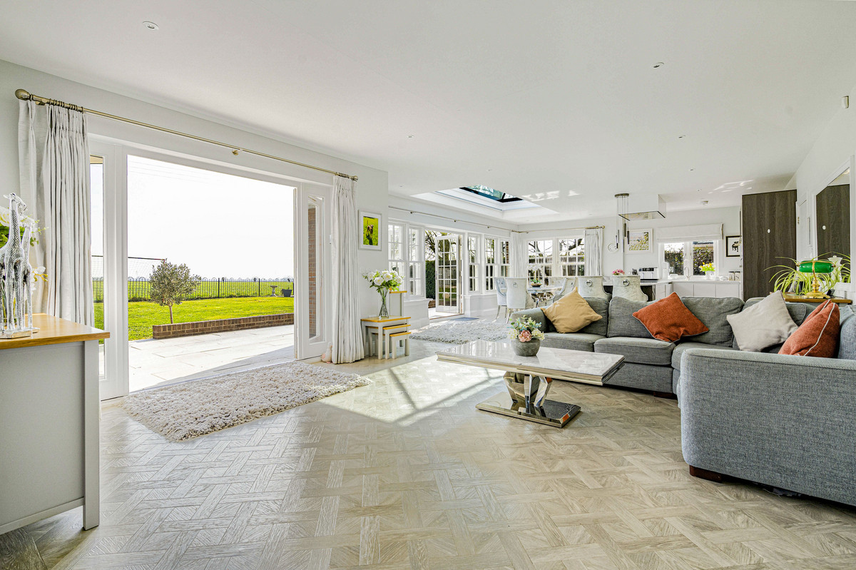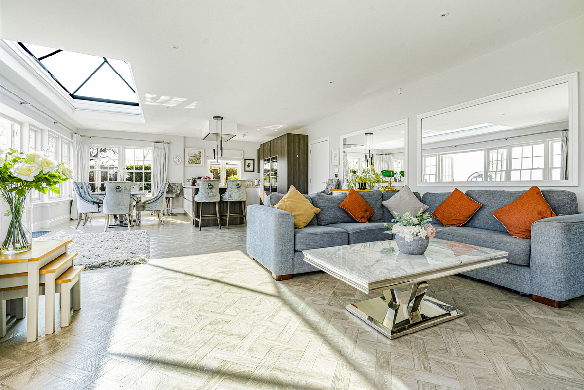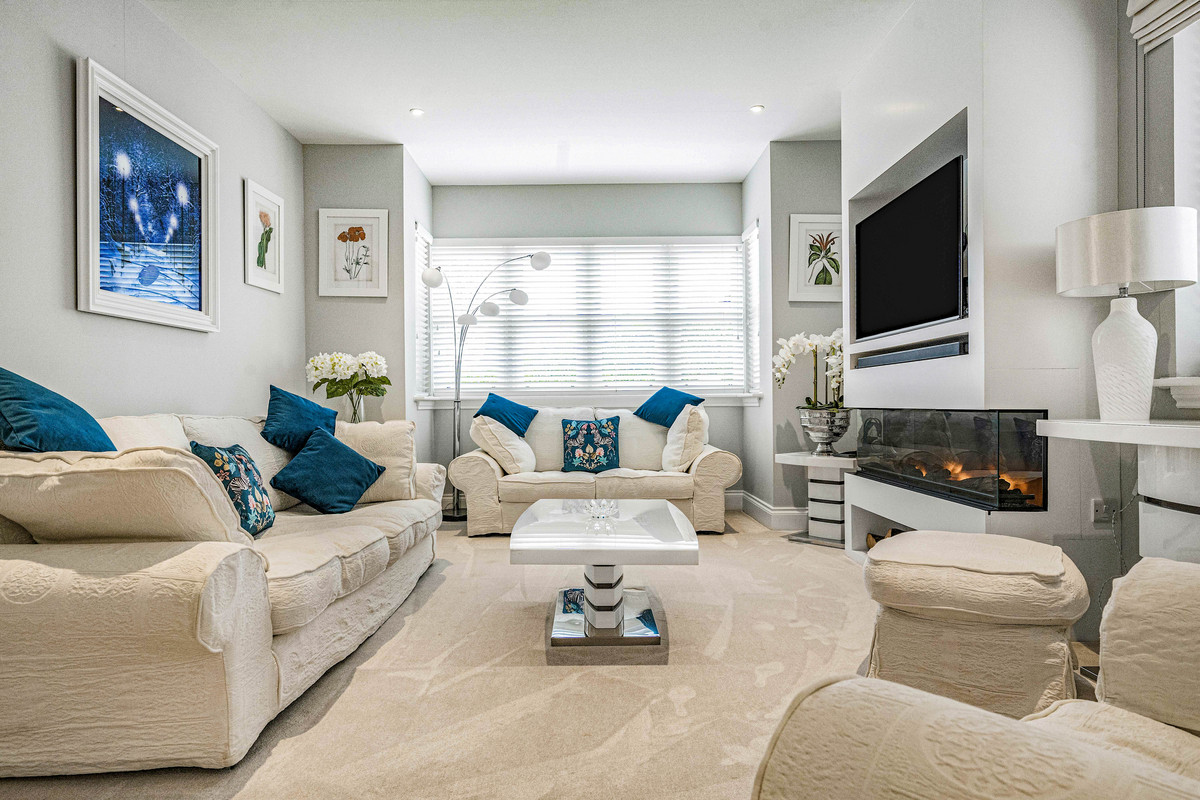 A particular feature of the house is the sleek fitted kitchen with ‘Silestone’ quartz work surfaces, breakfast bar and integrated appliances including; steam oven, two electric ovens, microwave, large fridge, dishwasher and wine fridges.