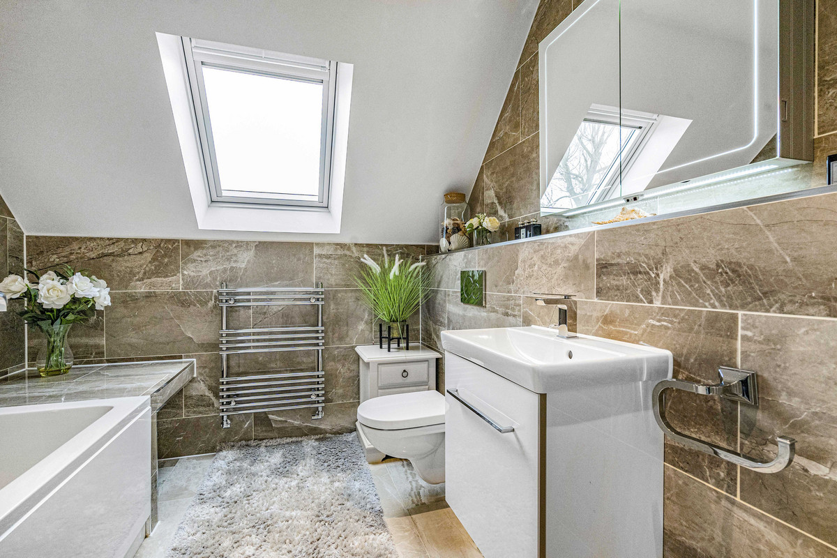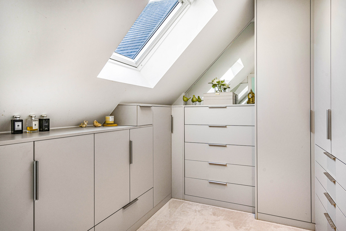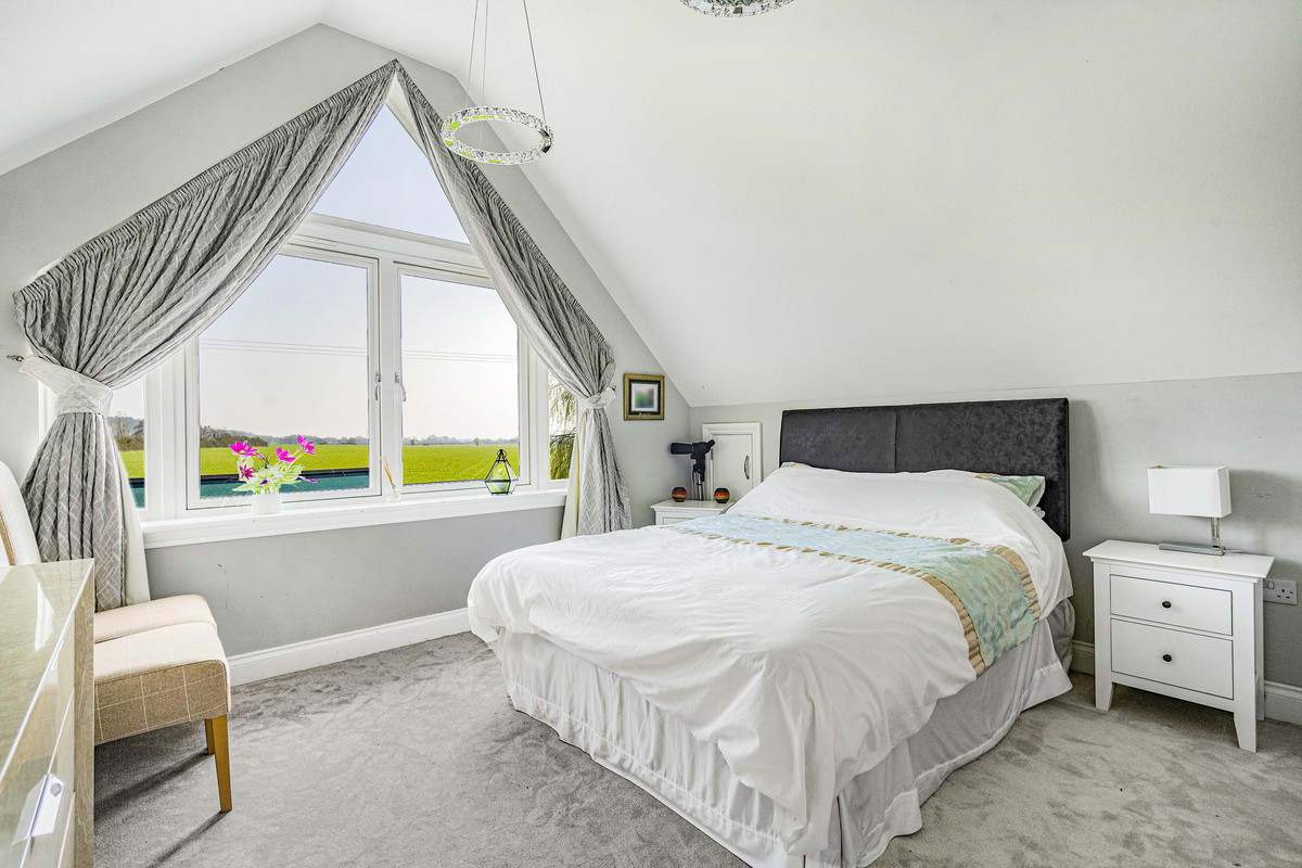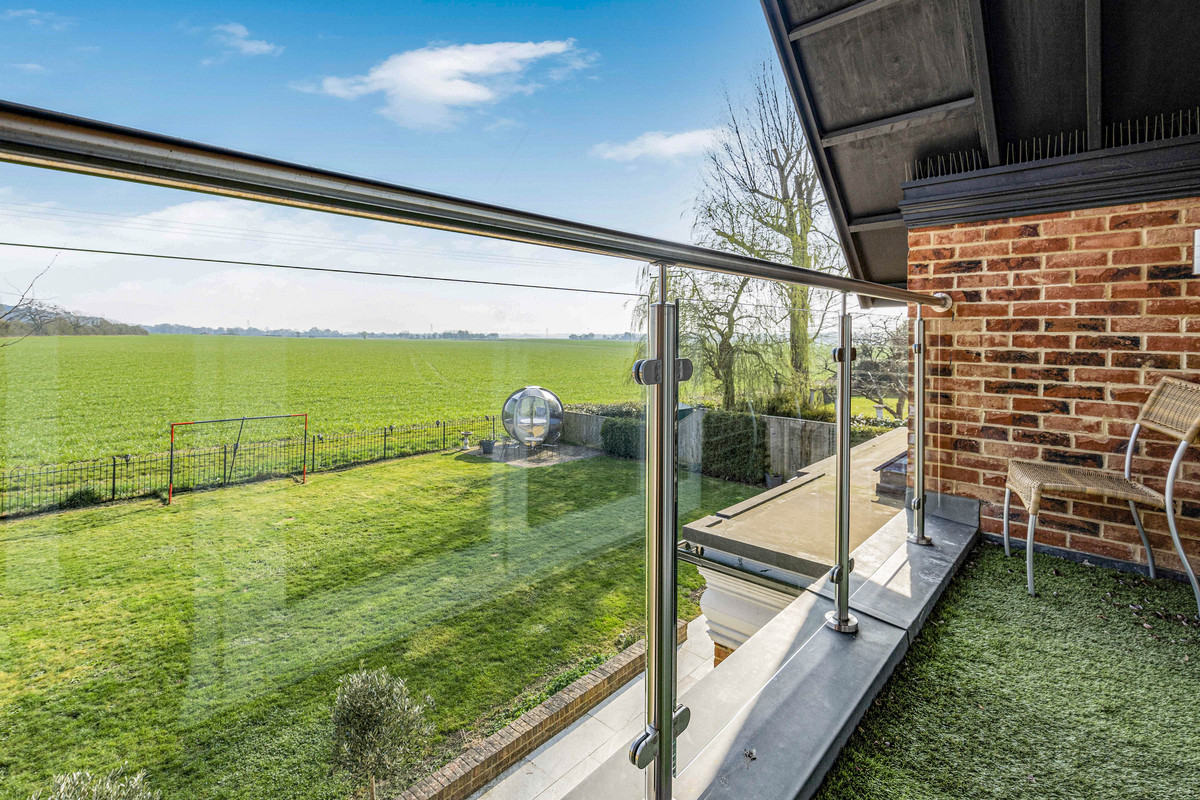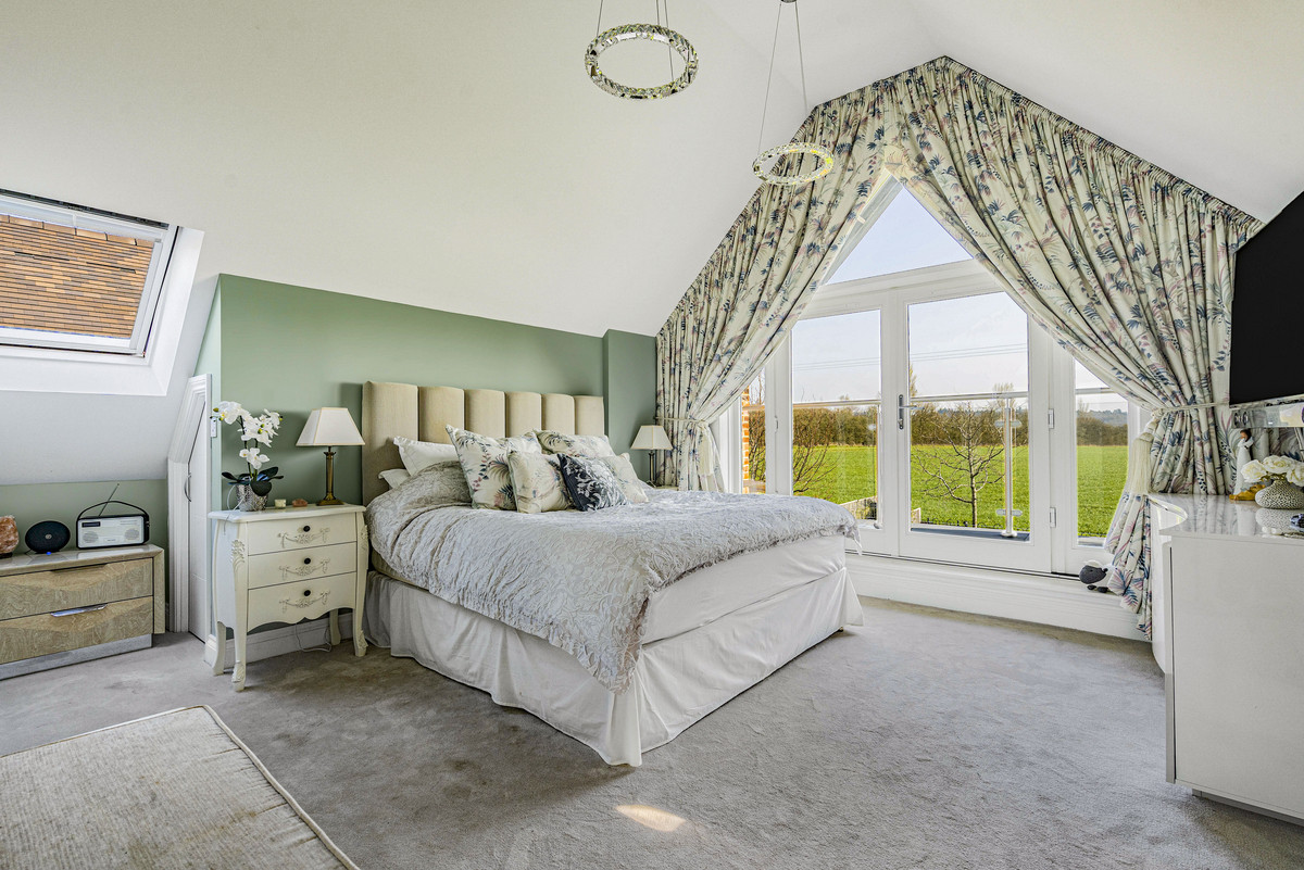 The main bedroom has a balcony with views over open countryside towards The Ridgeway. There is a vaulted ceiling, triangular window, bespoke-fitted dressing room a spacious en-suite with a double-ended bath and oversized shower. All three bathrooms are beautifully designed and fully-tiled with Villeroy & Boch sanitaryware.
